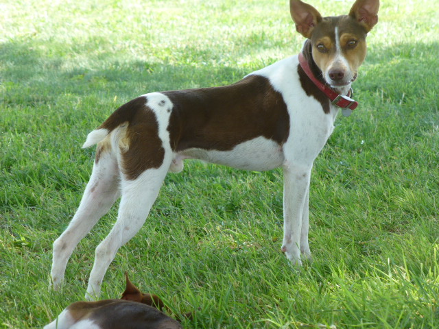 Like many people, we didn’t know there were large sized Rat Terriers. Oakie, named for the street he was found on, is beautiful. He is reddish brown patches on white, with “freckles” in his hair and on his belly. The vet thinks he is about 8 months. He is knee high, about 18″ long with a short, but not docked, tail and is about 22 pounds.