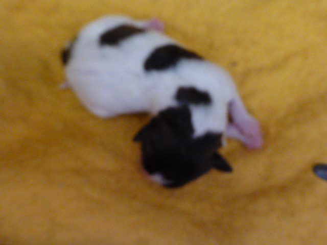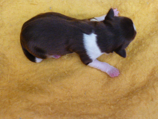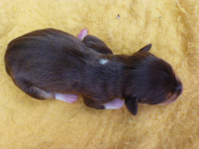 EmmaLee had her pups on Monday night, April 8th. She’s now the proud momma of 4 boys and 2 girls! One female is a light chocolate color with a small collar, the other female is a darker chocolate. There is one piebald pup. It’s a little boy, and the chunkiest of the group. Here’s pictures I took this morning of them. I’ll put up better pictures later. Momma’s doing really well. Can’t believe how much thinner she looks!