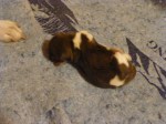 Sammie and pups are doing well, and she is being a very attentive momma. She had two females and two males starting at 3:50 am on Wednesday, January 29, 2014. By 4:30, she had had 3 pups, and at 6 I crawled back into bed. When we got up a half hour later, we were surprised to find another pup, male #2. The girls are both chocolate tris, the males are both chocolate piebalds. I am pleased that they all weighed consistently around 7 oz., the first female being a bit over, the second female being a bit under, and both boys just a shade under at 6.9 oz.