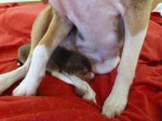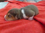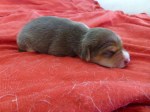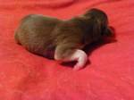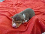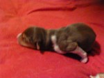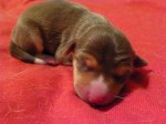 We were blessed with one singleton puppy on Christmas Eve. A little chocolate tri female, weighing in at 7.1 oz. Joy is the mom and doing a very good job, although at night she wants to sleep with us, but also wants to be with her pup. So it has been an interesting week to say the least. We weighed her again today, New Year’s Eve, and she’s doubled in size at 14 oz. Being a singleton, she doesn’t have to worry about having enough milk to drink, or lack of momma’s attention. I am handling her a little every day, doing some of the early stimulation on her, and just getting her used to people. She looks a lot like her momma Joy and her grandma Sammie, although it seems that her coloring is just a shade lighter or something. Will be interesting to see if she remains the same color or changes as she matures. Dew claws and tail are remaining as she was created.
