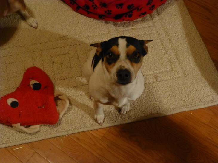 Just a quick brag about my Maddie! She is so darn smart! I had washed the blankets that are on the doggy end of my work table and was folding one up to put back down on the table. Maddie carefully pushed my desk chair up to the wall that is behind the table and computer desk using her front paws several times. With about three pushes, she was satisfied that it was against the wall and wouldn’t roll when she jumped on it, then proceeded to jump on it and up to the table. Wow! I was super impressed! I have seen the chair up against the wall on several occasions, just never thought that one of the dogs would put it there on purpose! I can’t have a favorite dog, but if I did, it would definitely be my little Maddie! She is a very special little Rattie!