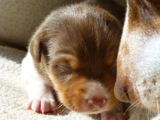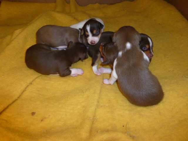 Pups were born on April 8th, 2013. We have 4 males and 2 females. All are tuxedos except for 1 piebald male. All are different shades of chocolate, from light chocolate to dark chocolate. All have white and tan markings. They should mature between 15″-17″. There is a possibility of a small standard, but I believe these pups will be at least 14 1/2″ to 15″ with a good chance of being larger.