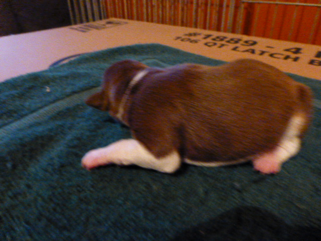 Charli and crew are now 4 weeks old. She’s lost most of her collar markings, as you can see in the photos and video. I have rolled her on her back, and she doesn’t seem to mind it. A low key puppy so far, although she’s the only one that I’ve heard do any ‘barking’ so far.