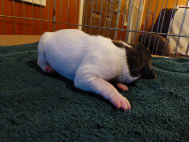 Gus is a big, piebald chocolate male Rat Terrier pup with tan markings. He weighed about 10 oz when he was born, and is now at 11 oz. I’m thinking he may be larger when he matures, possibly 16″ – 17″. This is my husband’s favorite one.